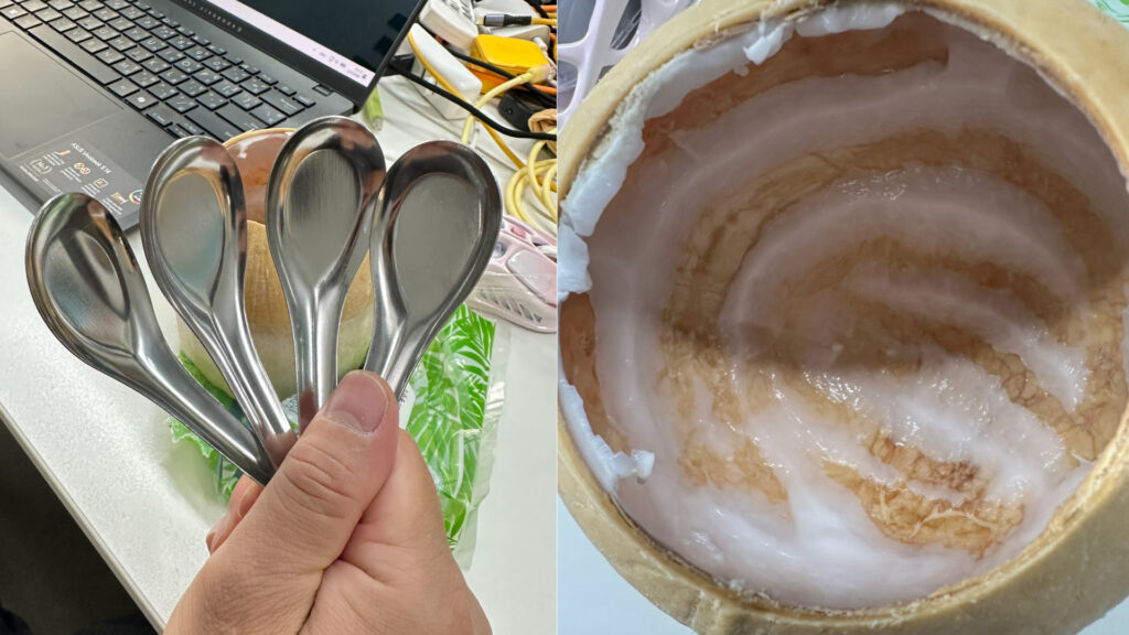 - แบบที่ 3 คือ เนื้อจะเป็นสีขาวสวย ยังเป็นมะพร้าวหนุ่ม ที่จะสร้างเนื้อครบแล้ว ชั้นเนื้อจะหนาขึ้น เวลาเอาช้อนตักจะออกแรงนิดหน่อย แต่ก็หลุดง่ายๆ เพราะช้อนที่ให้มาเป็นช้อนเหล็กหนา จับถนัดมือดี เนื้อมะพร้าวแบบที่ 3 จะกินได้ไม่เยอะไม่หมด เพราะจะให้รสชาติแบบกินเนื้อมะพร้าว เหมาะกับขูดไปใส่ไอศครีม หรือขนมกะทิมากกว่า
